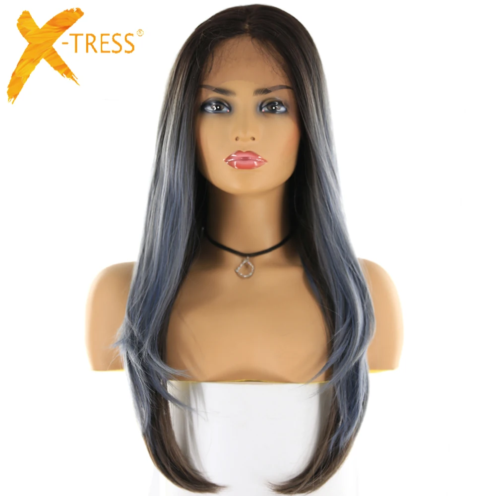X-TRESS Lace Front Synthetic Hair Wigs For Women Dark Roots Auburn Blonde 613 Ombre Color Straight Lace Frontal Wig Middle Part