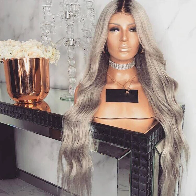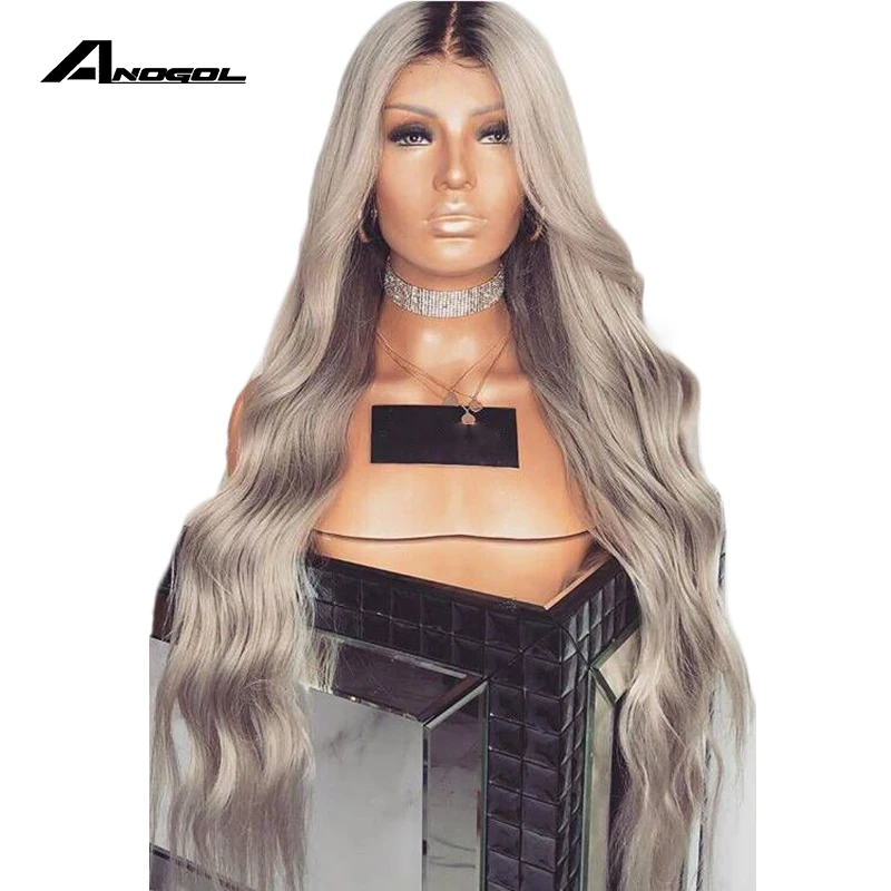Anogol Sliver Grey Long Loose Wave High Temperature Fiber Synthetic Lace Front Wig With Pre Plcuked Baby Hair Wigs For Women