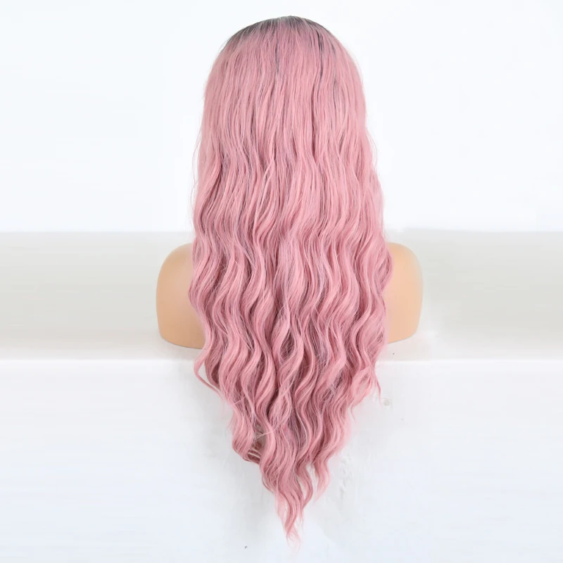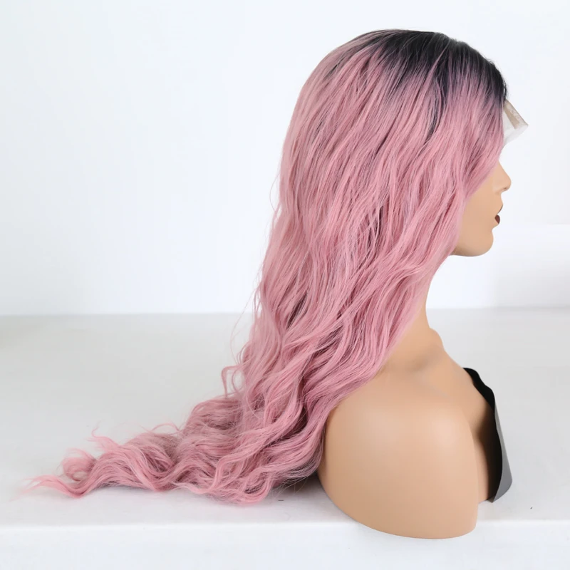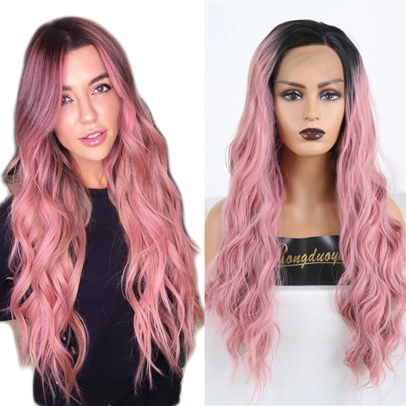 Related Product for RONGDUOYI Ombre Pink Body Wave Wig High Temperature Fiber Hair Synthetic Lace Front Wig Two Tone Co