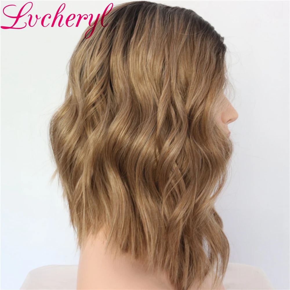 Lvcheryl Ombre Dark Roots To Blonde Short Bob Wavy Hand Tied High Temperature Fiber Heat Resistant Synthetic Lace Front Wigs