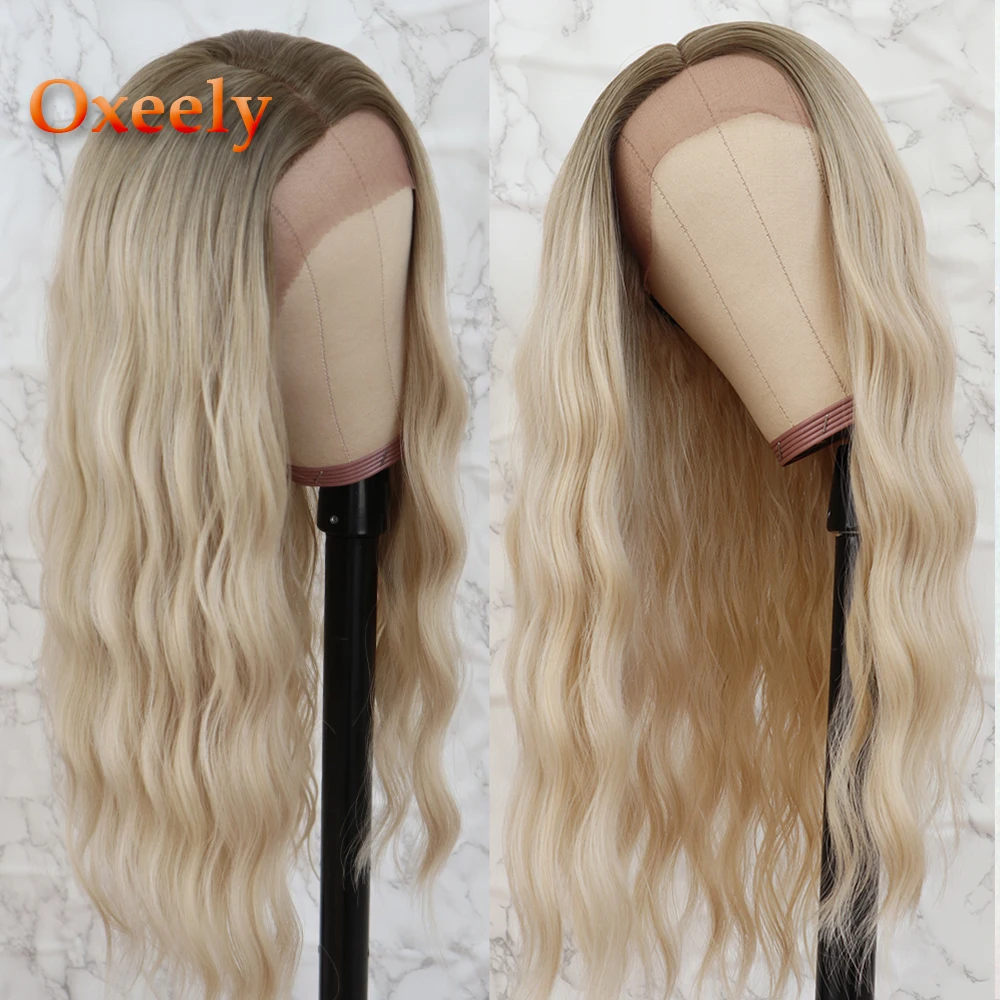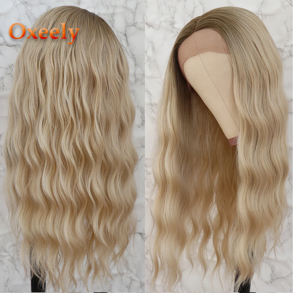 Related Product for Oxeely Platinum Brown Long Loose Wave Hair Lace Wigs Free Part Glueless Blonde Wavy Synthetic Lace